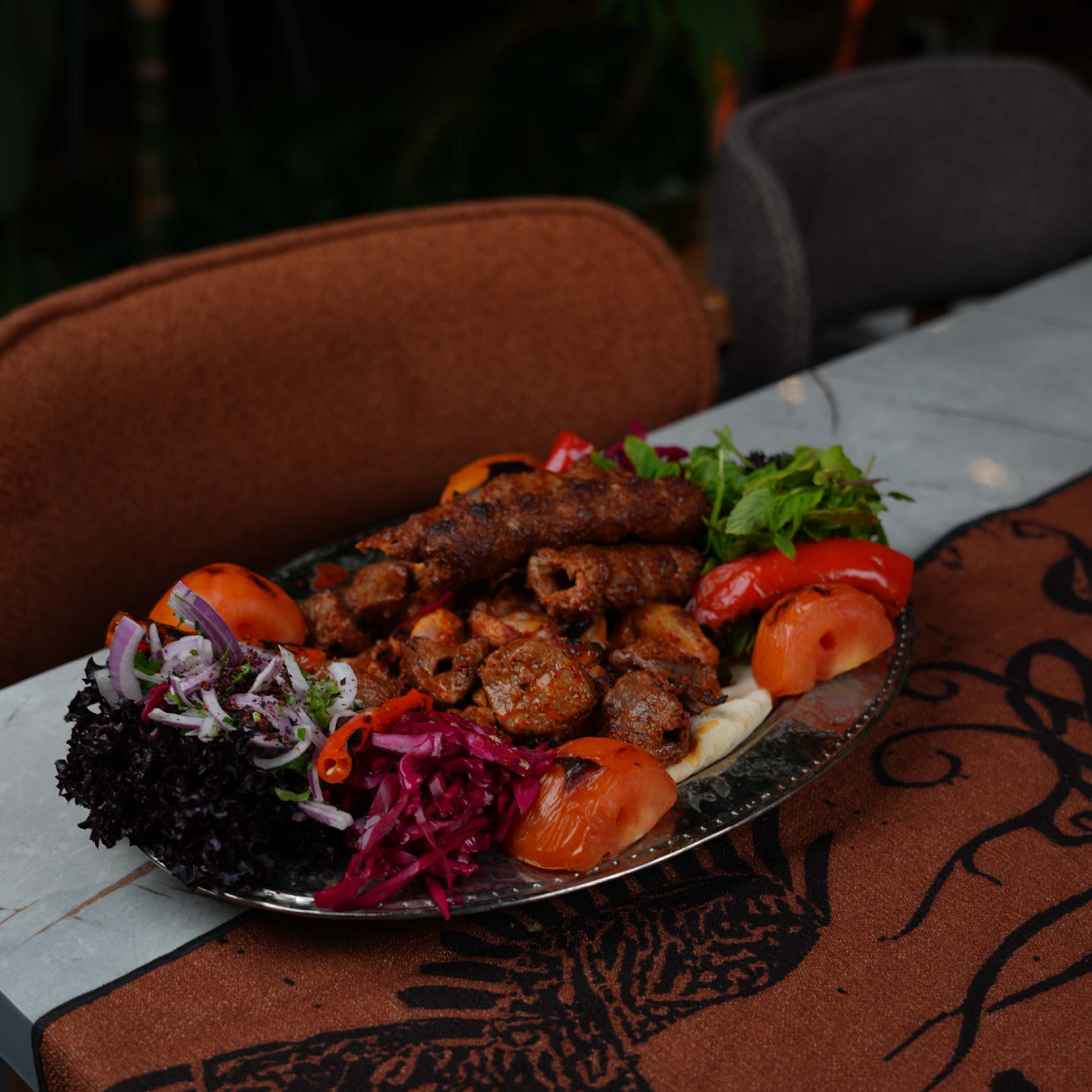 Süzme et, al biber, yeşil biberi, kibrit patates ve yoğurt ile